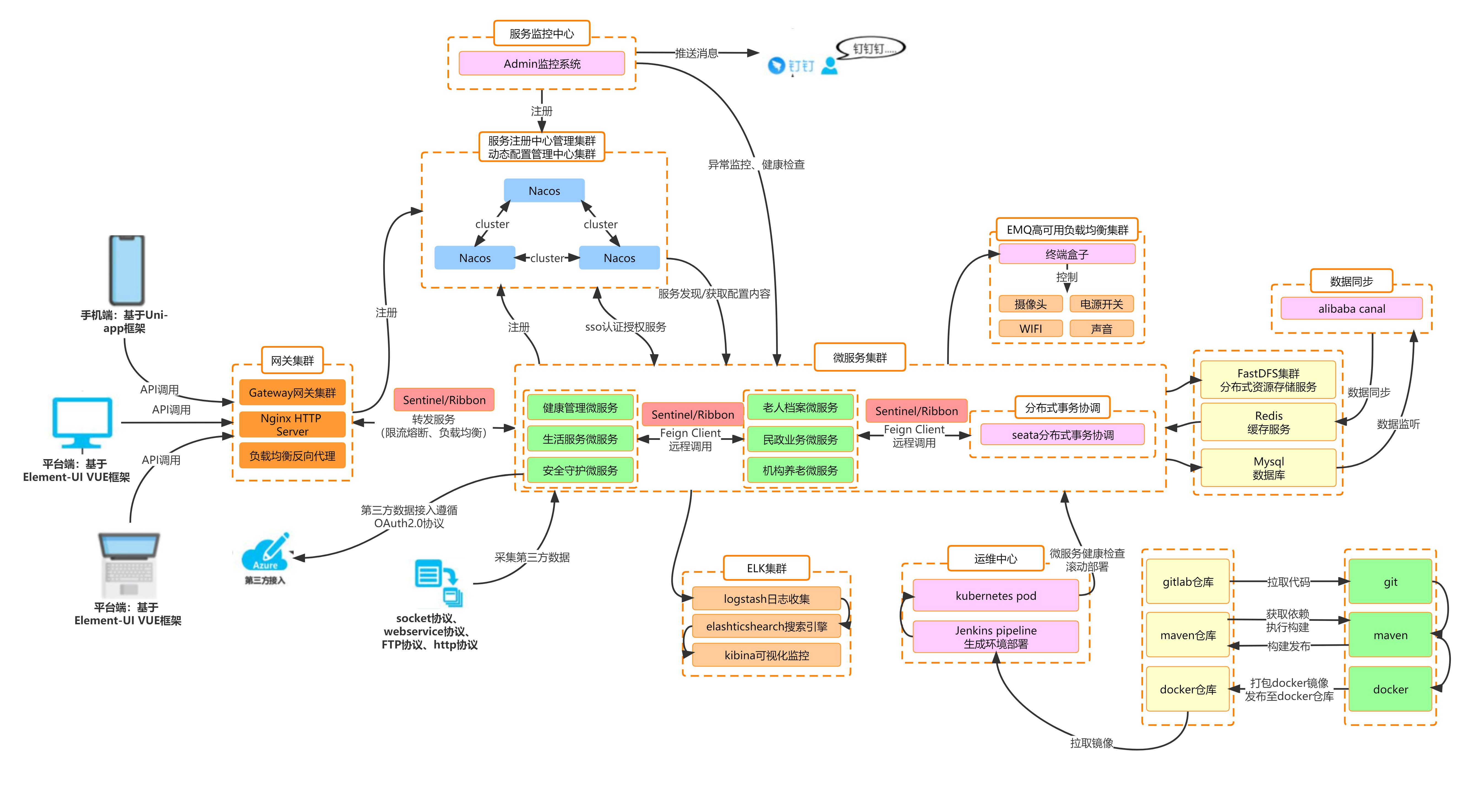 系统采用前后端分离的模式,前端基于 Vue、 Element-UI,后端采用Spring Cloud Alibaba 全家桶,并同时对其基础组件做了高度的封装,单独开源出一个框架:Maven中央库引入即可,减少了工程的臃肿,也可更注重于业务开发 集成Sentinel从流量控制、熔断降级、系统负载等多个维度保护服务的稳定性。注册中心、配置中心选型Nacos,为工程瘦身的同时加强各模块之间的联动。
